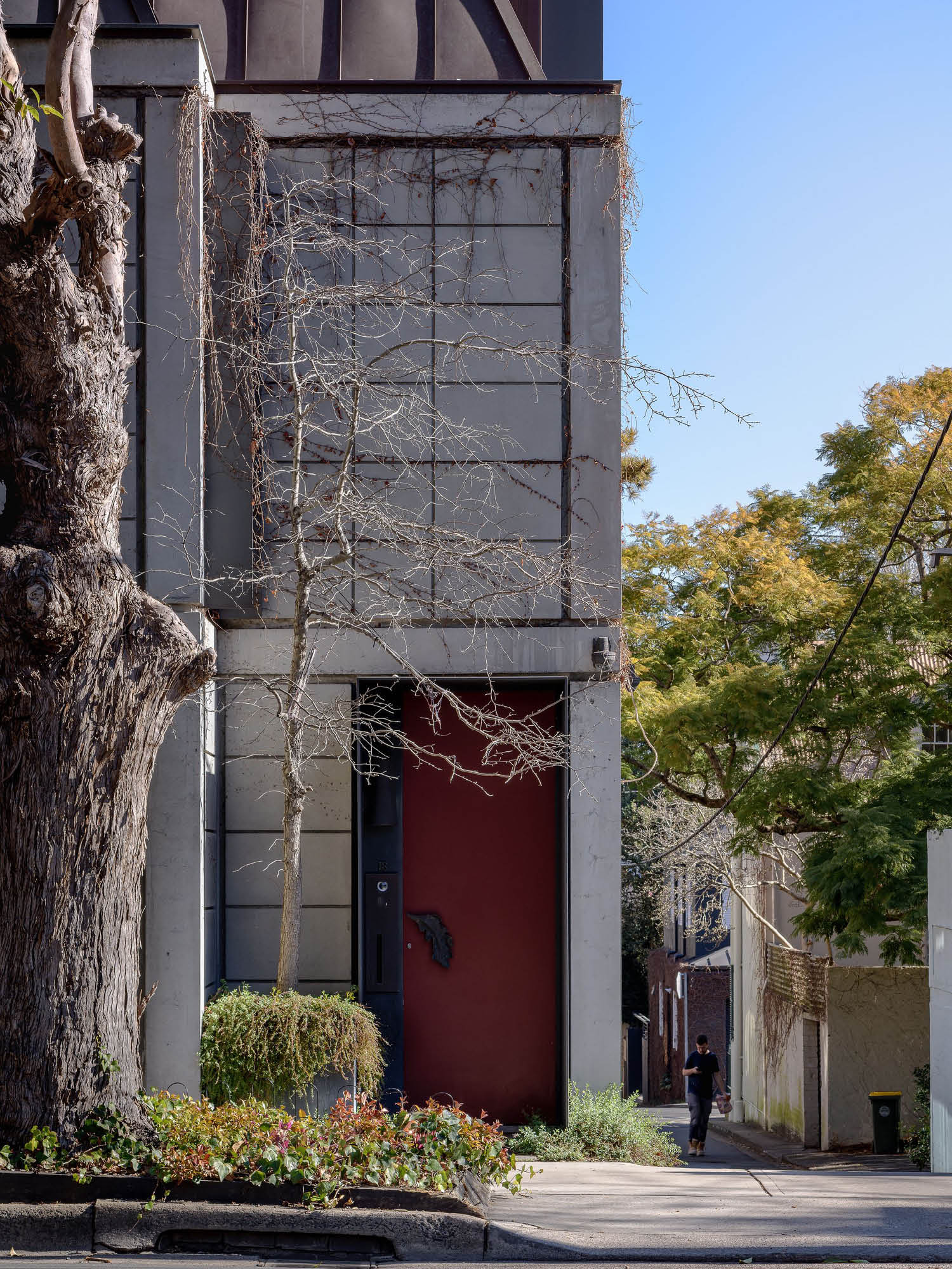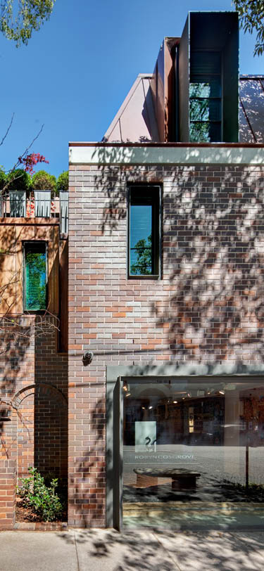The original two-storey 1920s residential building on the site, identified as a contributory item in the Woollahra Heritage Conservation Area DCP 2003, was converted in part to a doctor’s surgery in 1973 and then conserved and adapted to a rug showroom in 2003. The new three-storey addition comprises a two-bedroom home with large living, dining, kitchen and terrace spaces above a garage and entry.